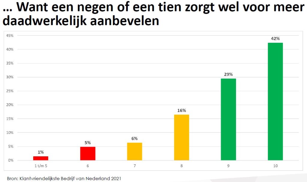 Daarbij heeft Market Response uit Nederlands onderzoek geleerd dat een 9 of 10 score krijgen op de NPS-survey betekent dat klanten je ook inderdaad écht meer gaan aanbevelen.